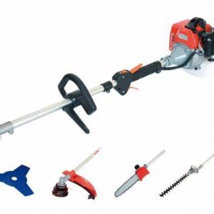 Increible kit multifuncion que incorpora cabezal de nylon y disco de tres puntas para desbrozar, un sierra podadora de 10″ y 43 cm y tambien un cortasetos regulable de doble corte