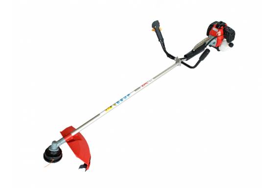 Desbrozadora de 2 tiempos con manillar abierto, incluye cabezal de nylon, disco de 3 puntas y arnes.