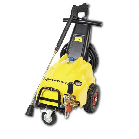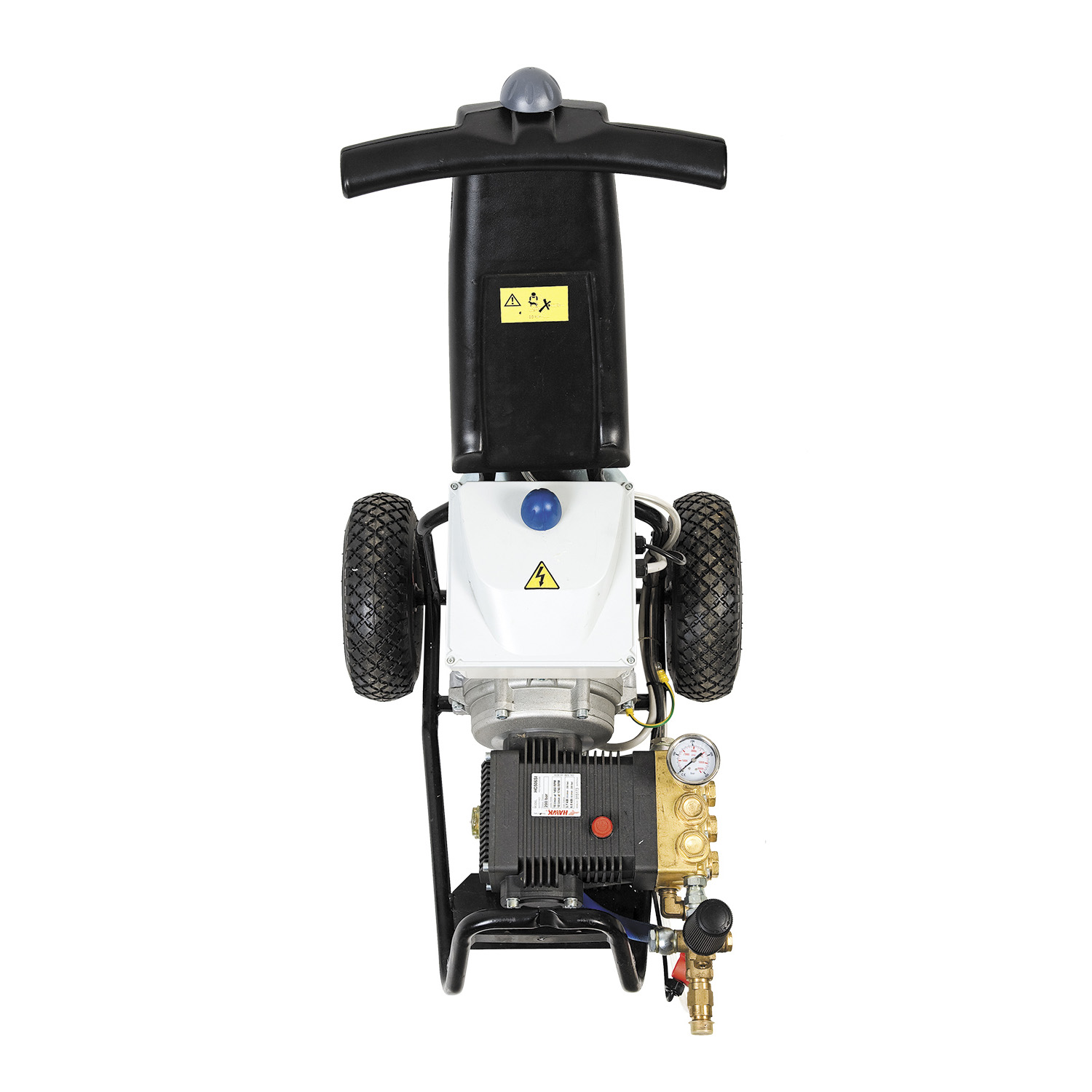 Hidrolimpiadora de agua fría, industrial, de 150 bar, 600 l/h y 2.600 W de potencia máxima. Es capaz de resolver cualquier problema en gremios tan distintos como agricultura, transporte, construcción, industria, etc. Bomba profesional de alto rendimiento, con 3 pistones cerámicos, sistema biela/cigüeñal y cabezal de latón. Motor eléctrico asíncrono de servicio continuo y asilamiento clase F, unión motor bomba por junta elástica, manómetro en baño de glicerina, válvula by-pass regulador de presión, sistema TST paro total, chasis de acero, 2 ruedas fijas y 1 giratoria con freno y múltiples accesorios.