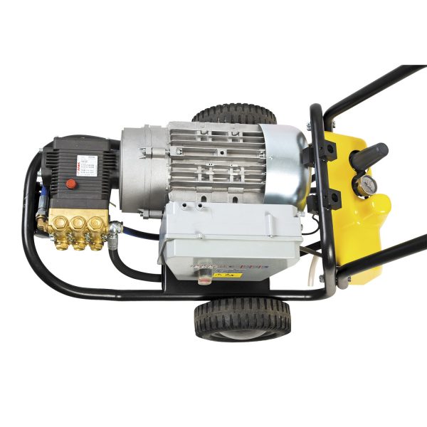 Hidrolimpiadora de agua fría, de servicio intensivo, a 200 bar, 1.200 l/h de caudal y 9.400 W de potencia máxima. Preparadas para trabajos exigentes, y diseñadas para un uso intensivo, esta hidrolimpiadora resuelve cualquier problema de limpieza en un menor tiempo dentro de gremios como industria, agricultura, ganadería, construcción, transporte, etc. Bomba profesional de alto rendimiento, con 3 pistones cerámicos, sistema biela/cigüeñal y cabezal de latón. Motor eléctrico asíncrono de servicio continuo y asilamiento clase F, unión motor bomba por junta elástica, válvula by-pass regulador de presión, sistema TST paro total, chasis de acero, 2 ruedas fijas y 1 giratoria con freno y múltiples accesorios.